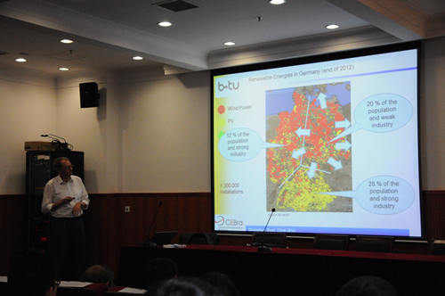 9月24日,应光电学院电气工程系教师邀请,德国科特布斯工业大学(BTU)能源技术中心主任Harald Schwarz教授来我校进行交流访问。当天下午,Schwarz教授在格致堂201报告厅为我校师生做了题为“科特布斯工业大学对德国新能源并网所做的贡献”的专题讲座,主要介绍了德国新能源建设的现状、存在的问题以及解决的方案,并就中德两国在智能电网建设过程中遇到的问题与在场师生进行了交流。