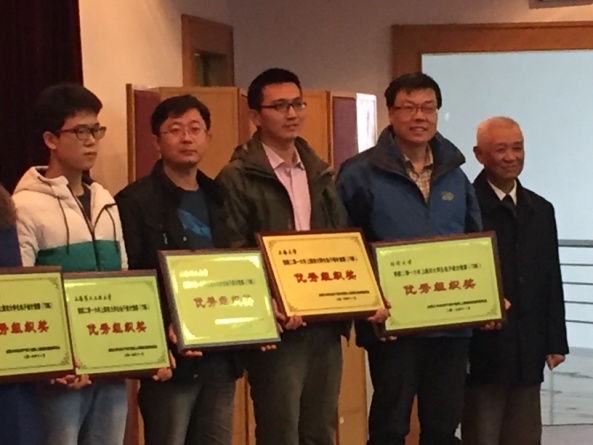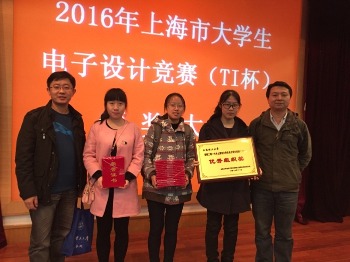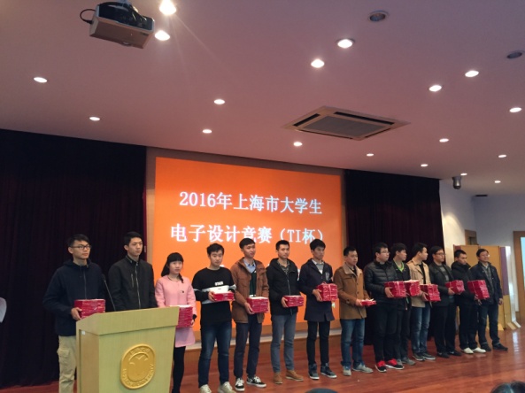 2016年11月25日,上海市大学生电子设计竞赛颁奖仪式在上海大学方润华讲堂举行。本届大学生电子设计竞赛在暑期的7月25日举行,经过三天两夜的激烈角逐,来自上海市高校的300多支代表队按时提交了自己的设计作品,在开关电源、数字通信、参数检测、实感和无人机选题上发挥了同学们的创造性。我校学子取得二等奖2项,三等奖5项的优良成绩,学校获得优秀组织奖。在参赛同学中,杨菁、孙玉棉、林天琪小组设计的“交互式视力身高测试系统”以双目视觉技术为载体,充分发挥手势识别和语音识别功能,自动完成了体检测试中的视力检测和身高测量,并实时给出测试报告,给人一种全新的体感辅助医疗体验;张世彦、王佳宁、雍琛琛小组设计的“智能交互式家庭实感控制系统”既能完成通过手势进行各种智能电器的开关控制,又能完成红外人物入侵检测,既满足了生活中的全体感控制体验,又可以完成家居安防设计,并且可以进行实时的体感游戏互动、画图、文字输入等功能。其他小组在无人机领域,也进行了充分的技术展示。
