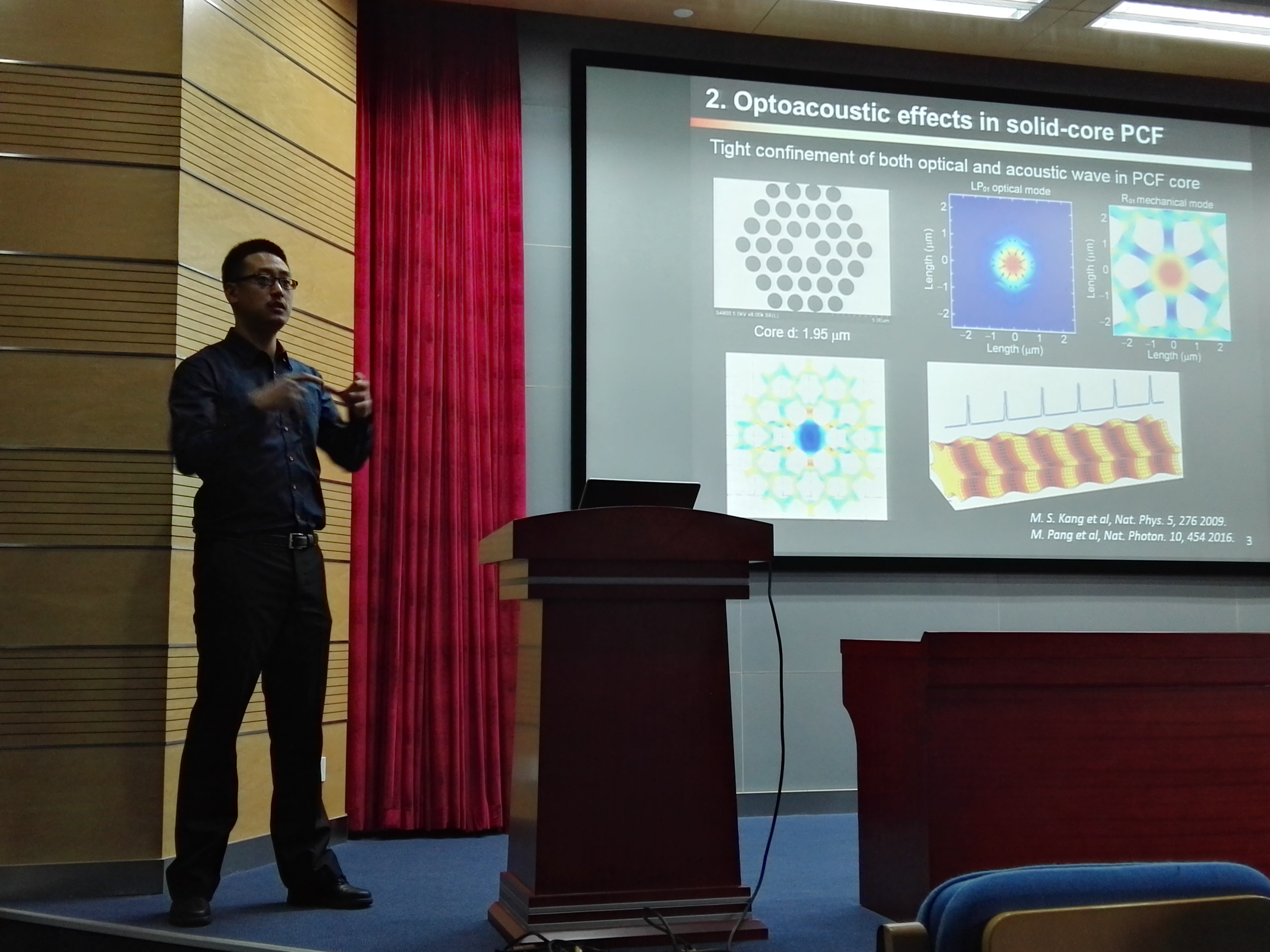 庞盟博士在这次讲座中介绍了利用光子晶体光纤中声光谐振效应的光纤激光器系统。 重点讨论了如何利用这一系统产生重复频率高达千兆赫兹的飞秒脉冲光源,指出了激光腔内的强光机械相互作用导致了激光器多纵模间的相互耦合,从而产生一系列强束缚激光孤子态。这些孤子态的重复频率和光子晶体光纤的机械谐振频率锁定,能达到千兆赫兹。最后,庞盟博士介绍了如何基于这个声光效应来实现光纤激光腔内的长时间全光信息存储。该高重复频率的光线激光器在光通信,光存储,光与物质的相互作用等方面都具有重要的应用价值。庞盟博士近期的系列研究成果也都发表在世界顶级期刊上(Nature Photonics, Optica等)
