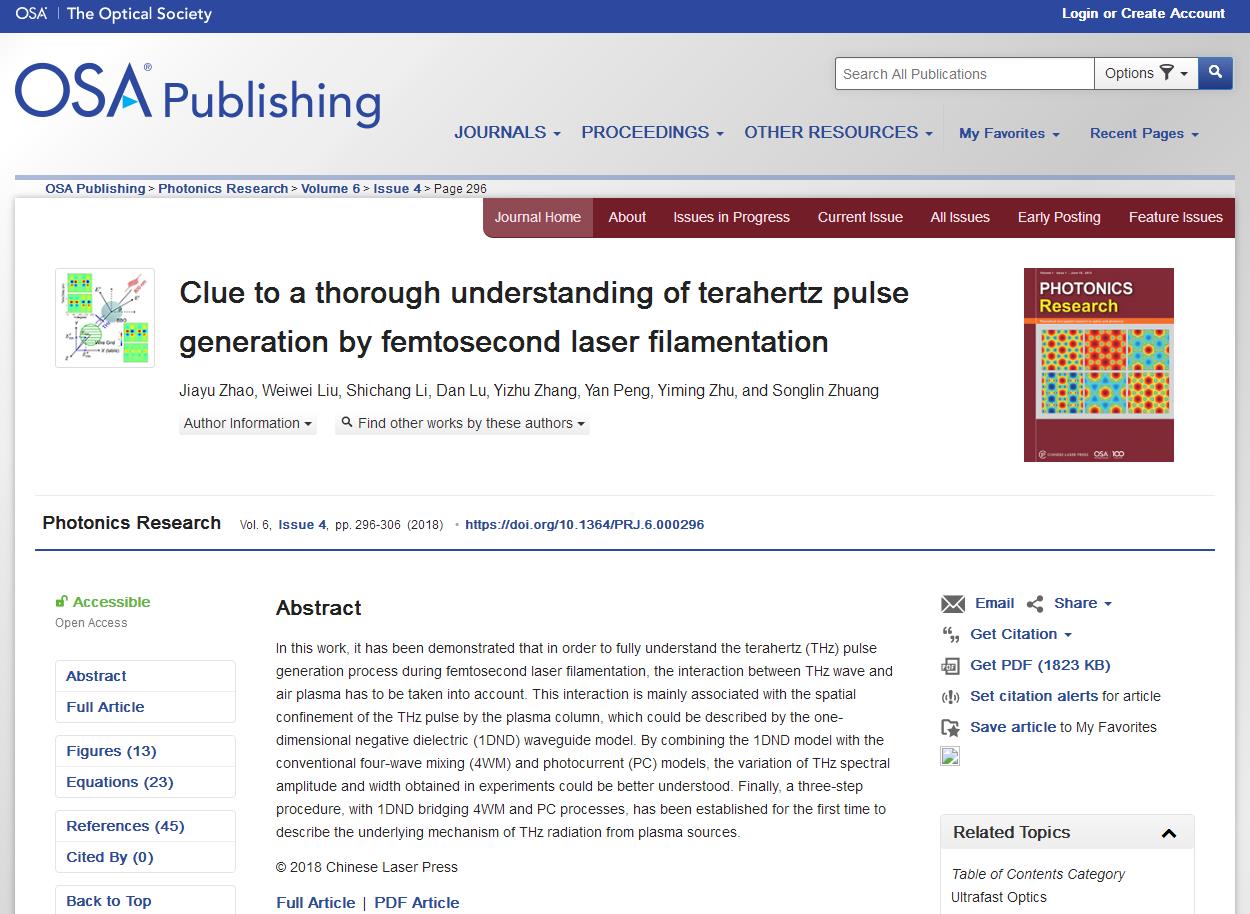近日,金沙2004路线js5太赫兹技术创新研究院朱亦鸣教授课题组与南开大学现代光学研究所刘伟伟所长合作,在国际高水平光学期刊《Photonics Research》上发表了题为《Clue to a thorough understanding of terahertz pulse generation by femtosecond laser filamentation》[Photon. Res. 6(4), 296-306 (2018)]的研究成果。金沙2004路线js5太赫兹技术创新研究院青年讲师赵佳宇为第一作者,刘伟伟教授、彭滟教授、朱亦鸣教授为共同通讯作者。