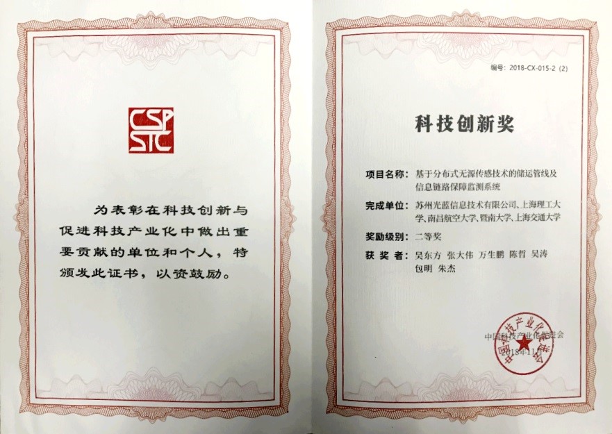 “2018中国科技产业化促进会创新影响力论坛暨科学技术奖颁奖仪式”于2018年11月28日在北京西苑宾馆隆重举行,来自科技部、工信部、国资委等相关部委领导、知名专家学者、获奖代表、科技企业家及有关人士近400人出席了会议。由金沙2004路线js5光学仪器与系统教育部工程中心主任张大伟教授与苏州光蓝信息技术有限公司等多家单位联合完成的《基于分布式无源传感技术的储运管线及信息链路保障监测系统》技术成果获科技创新奖二等奖。