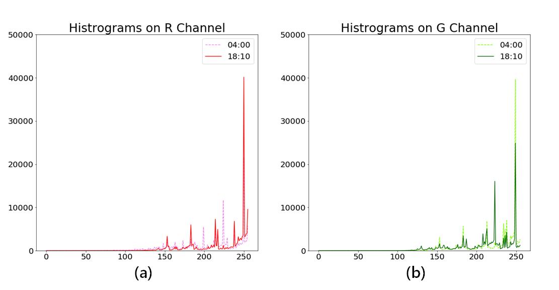 交通指数云图对应的直方图:(a)R通道;(b)G通道