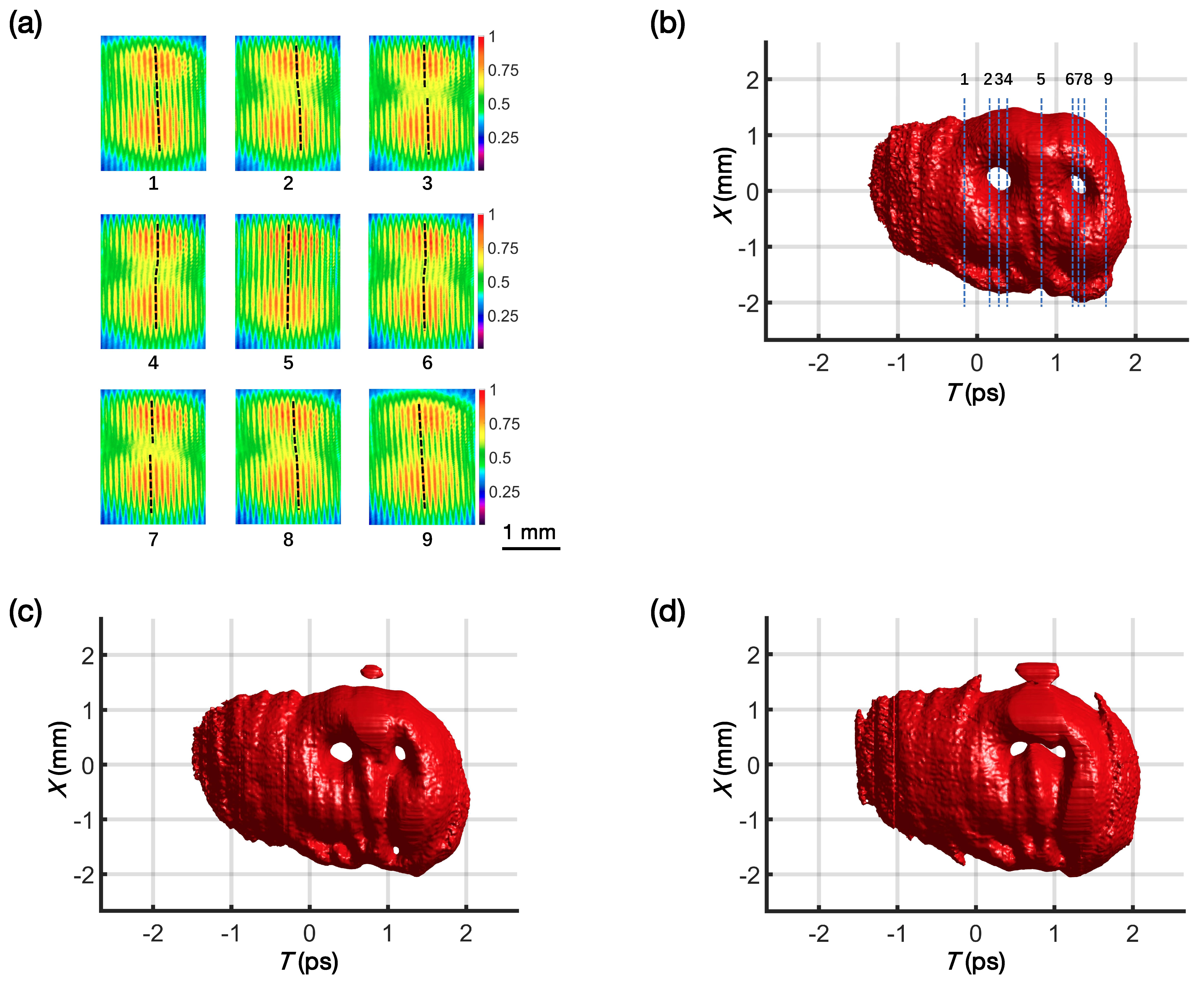 图1 携带时变轨道角动量的超快时空波包的产生。a)时空波包与参考脉冲的干涉图案;b)包含时间间距为1.00ps且拓扑荷分别为+1,-1的两个时空涡旋的时空波包;c)包含时间间距为0.74ps且拓扑荷分别为+1,-1的两个时空涡旋的时空波包;d)包含时间间距为0.51ps且拓扑荷分别为+1,-1的两个时空涡旋的时空波包。