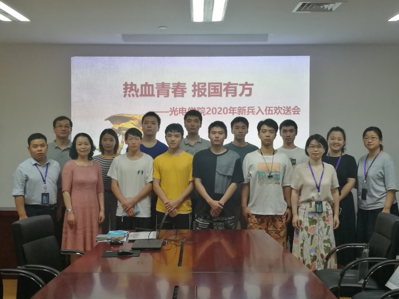 98日上午,光电学院2020年大学生新兵入伍欢送会在光电楼1026会议室举行,光电学院党委副书记曹英,辅导员代表,退伍老兵代表,以及全体八位应征新兵出席了欢送会。