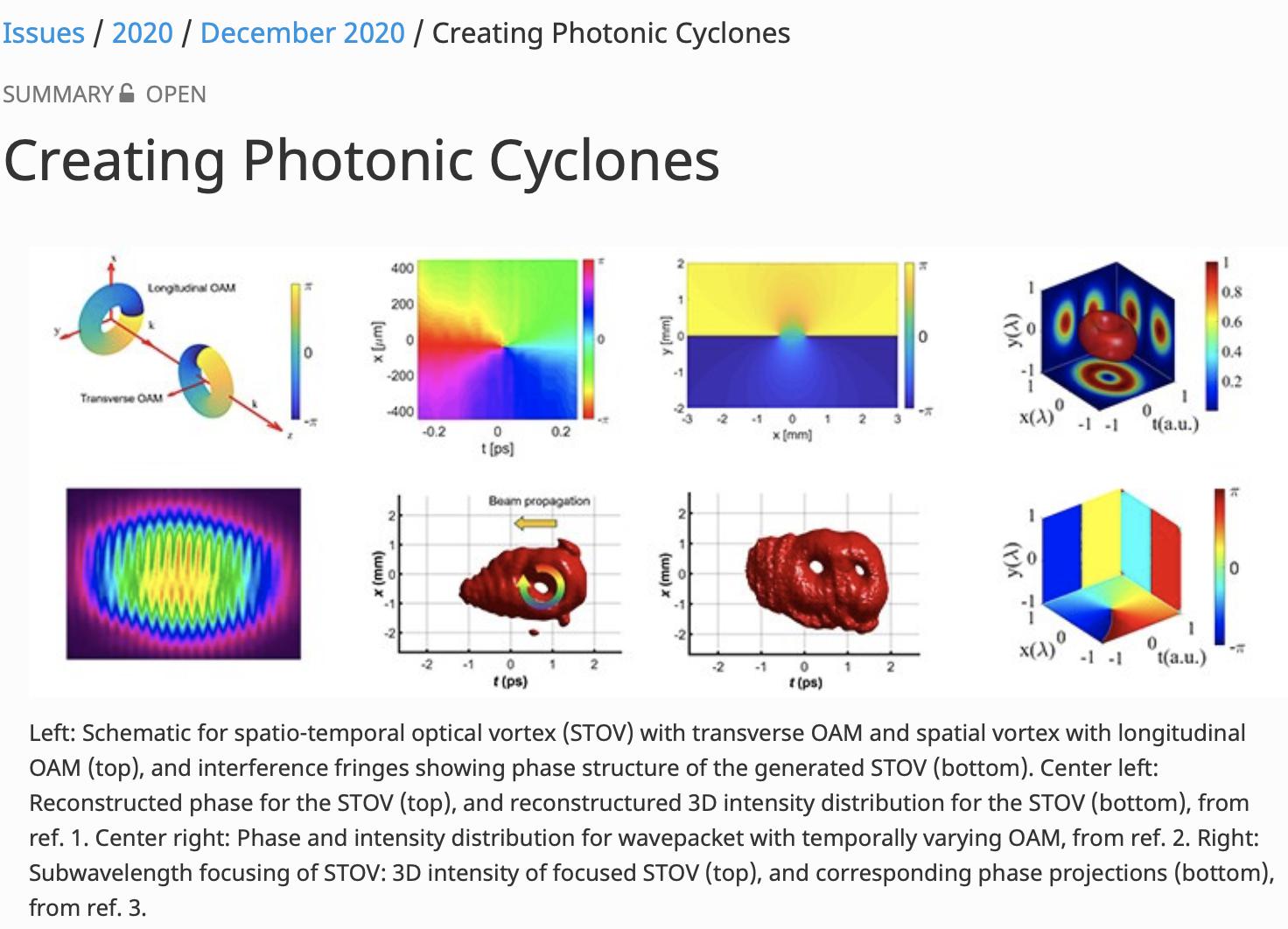 研究团队创造性地利用空间频率-频率面到空间-时间面的傅里叶变换,成功生成并表征了携带横向光子轨道角动量的超短脉冲光学波包。这一新型光波包在光子能量快速向前传输的同时,光子能流围绕一个随波包移动的横向轴旋转,形成类似于快速移动的光子“飓风”。这一研究发现最近也被中国激光杂志社评选为2020年度“中国光学十大新闻”(https://mp.weixin.qq.com/s/CZsOcQ7a-EIkUQj2bZHlEA)。