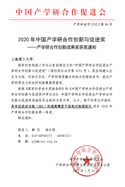 1月23日中国产学研合作促进会【产学研函字(2021)第06号】发布通知。经中国产学研合作创新与促进会组织专家对项目进行评审,我校金沙2004路线js5庄松林院士领衔、韩森教授团队攻关的“具有抗扰动功能(QHL)的超高精度平面绝对检测技术”项目荣获2020年中国产学研合作创新成果一等奖。