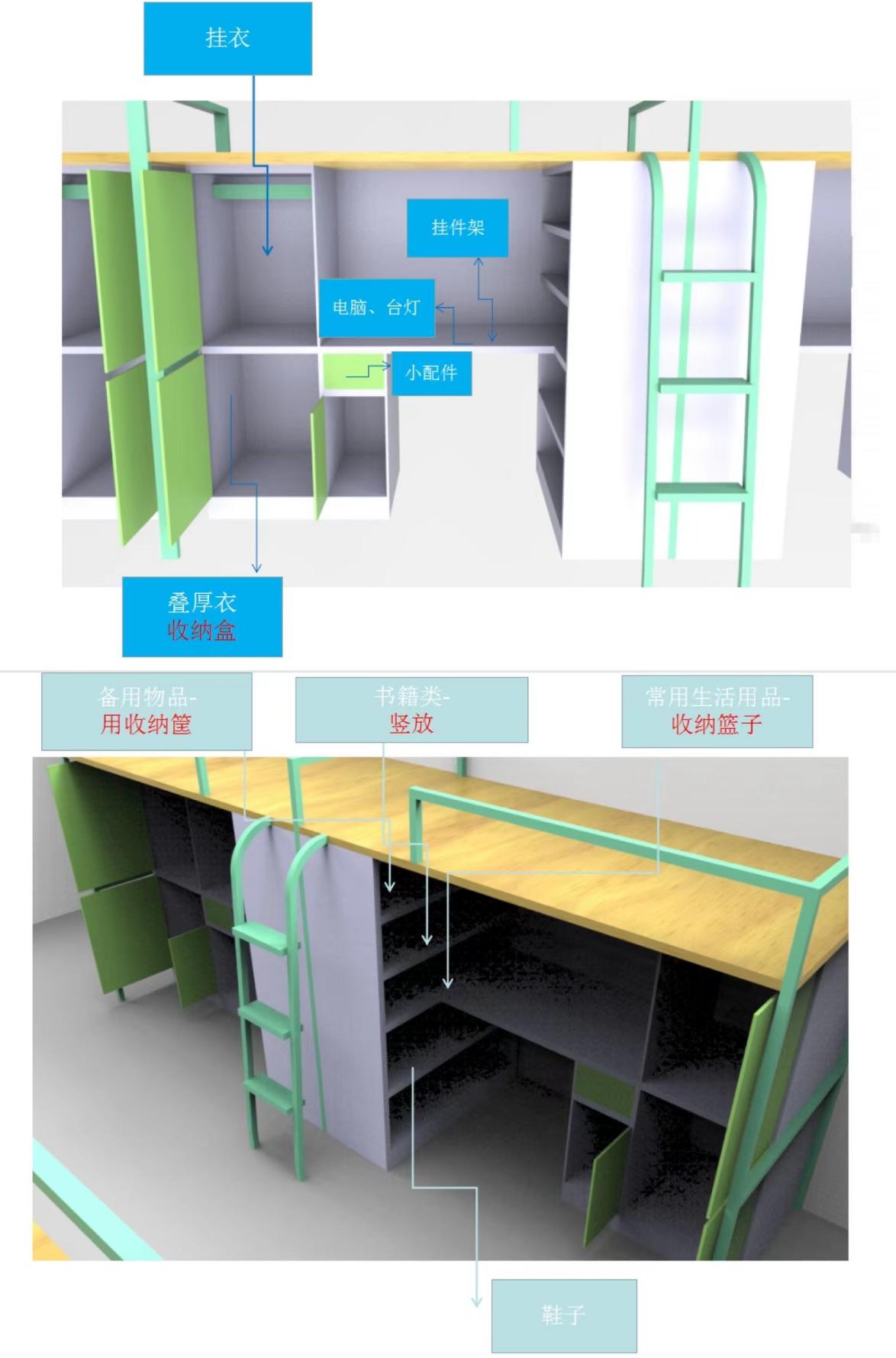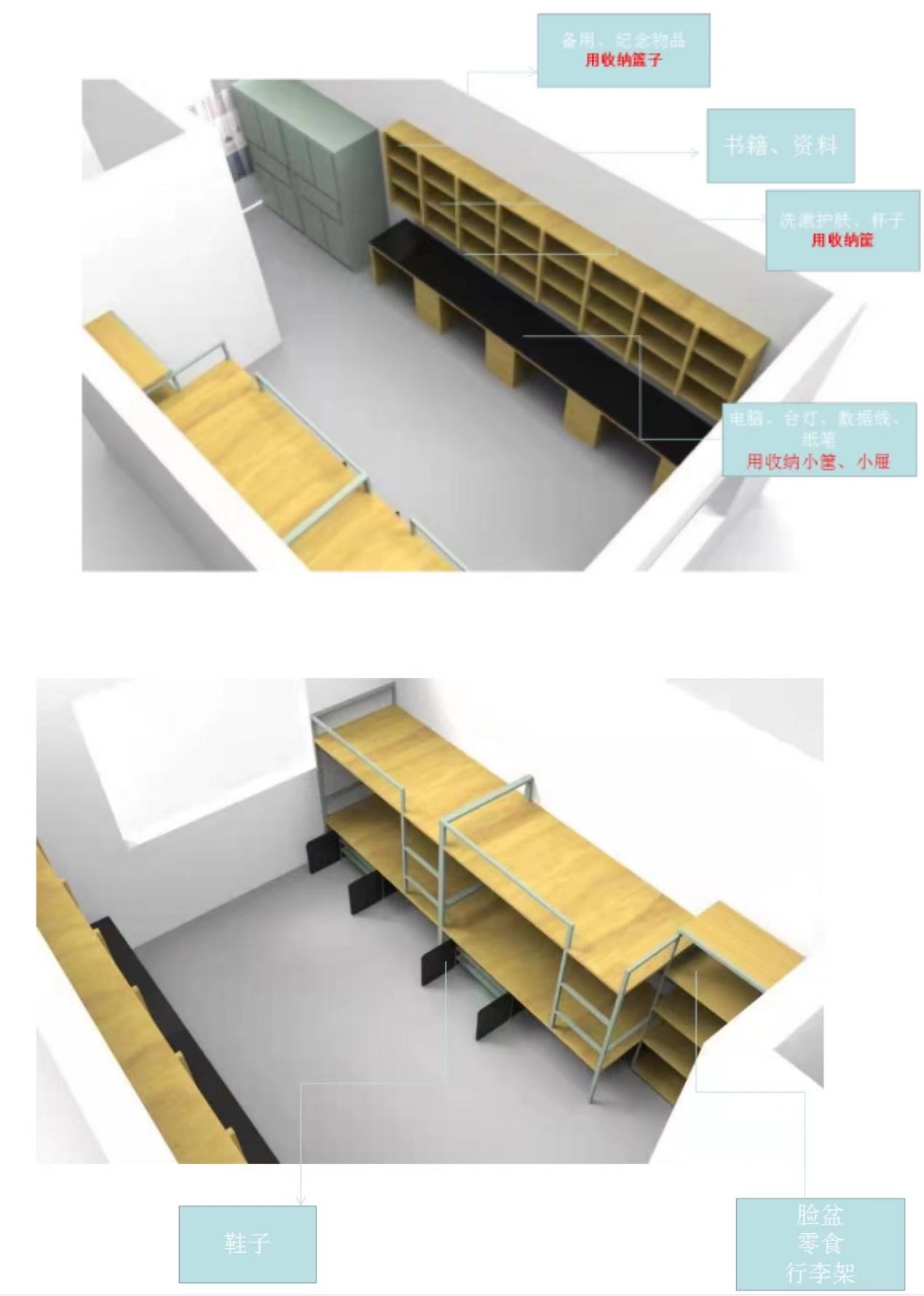 此次打造的“上床下桌式”寝室和“床柜分离式”寝室为更多的同学提供了对照的样板,只要大家开始动手行动起来,就可以收获更高品质的生活!