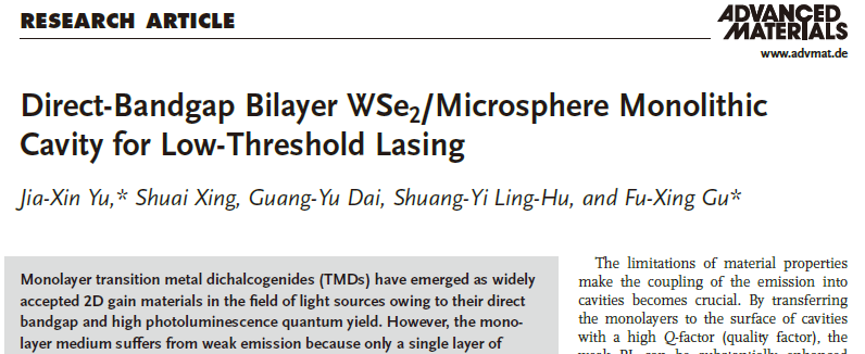 近日,庄松林院士领衔的未来光学实验室、谷付星教授课题组在国际顶级期刊Advanced Materials(影响因子30.849)上发表了题为“用于低阈值激光的直接带隙双层硒化钨(WSe2)/微球一体腔”(”Direct-Bandgap Bilayer WSe2/Microsphere Monolithic Cavity for Low-Threshold Lasing”)的研究成果。该论文由谷付星教授和于佳鑫副教授为共同通讯作者,于佳鑫副教授与博士生邢帅为并列第一作者。该研究工作的方案设计、实验、模拟工作均在金沙2004路线js5未来光学实验室完成。