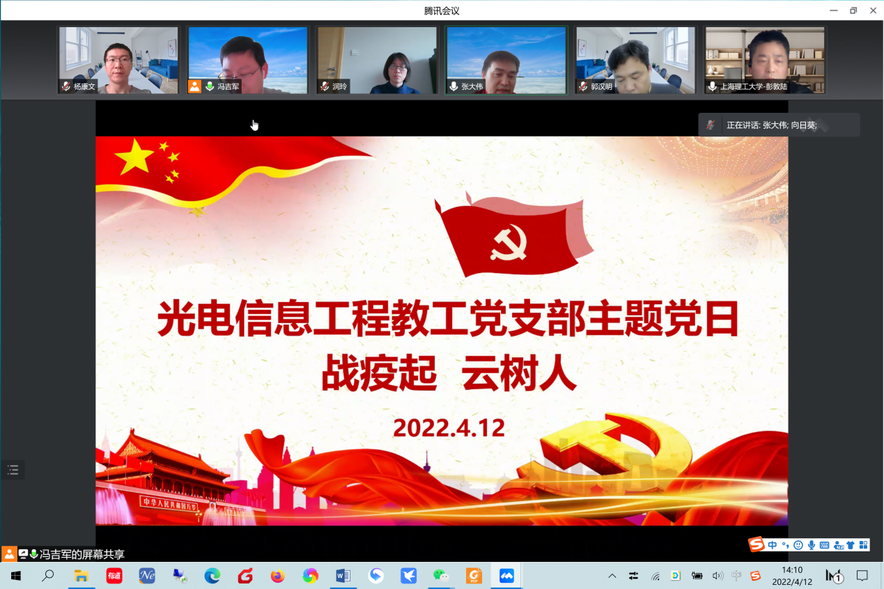 近日,在上海市和学校全面抗击疫情的关键时期,全国党建工作样板支部光电信息工程教工支部通过腾讯会议的方式,线上召开了“战疫起 云树人”的主题党日。光电学院党委书记袁媛、常务副院长张大伟、联系支部的副院长彭敦陆与支部全体教工一起,结合近期抗击疫情过程中,高校老师如何发挥党员先锋模范,如何做好本职工作参与志愿活动做好立德树人开展课程思政做好情绪管理等方面开展交流和讨论。此次会议召开对于坚定必胜信念,打赢抗疫防控战,具有重要的意义。