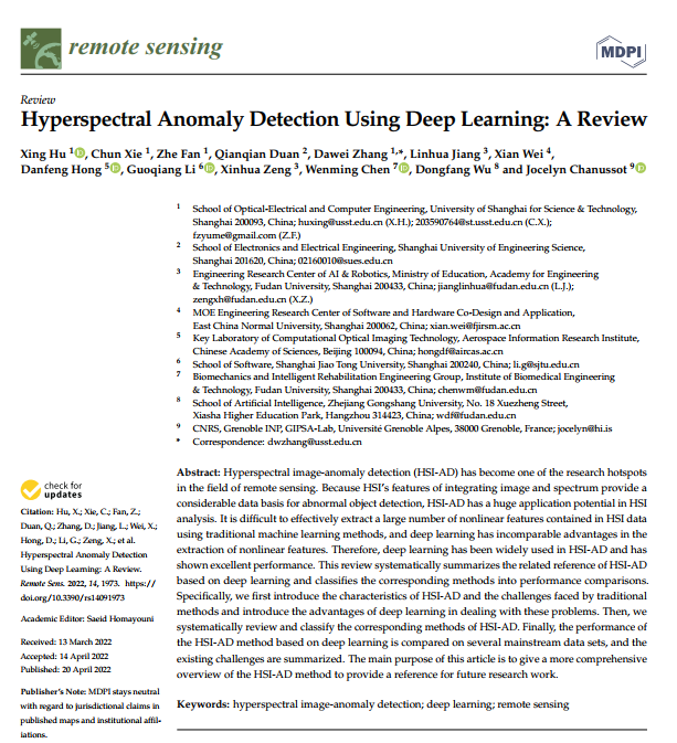 2020级硕士研究生谢春在遥感领域国际期刊《遥感》(Remote Sensing)(IF:4.848;JCR分区:Q1)发表关于综述论文,题目为“基于深度学习的高光谱图像异常检测综述Hyperspectral Anomaly Detection Using Deep Learning: A Review”。该论文的指导教师为胡兴副教授和张大伟教授。在遥感领域高光谱图像异常检测(HSI-AD)已成为研究热点之一。 由于HSI的“图谱合一”的特点为异常物体检测提供了相当的数据基础,使得HSI-AD在HSI分析中具有巨大的应用潜力。传统的机器学习方法难以有效提取HSI数据所包含的大量非线性特征,而深度学习在非线性特征的提取上有着不可比拟的优势。因此,深度学习已被广泛应用于HSI-AD中,并表现出了卓越的性能。本文首次系统总结了基于深度学习的HSI-AD相关文献,并进行了相应的方法归类于性能对比。具体的,首先我们介绍了HSI-AD的特征以及传统方法所面临的挑战,并介绍深度学习在处理这些问题上的优势。然后,我们将HSI-AD相应的方法进行系统性的回顾与分类。最后,对基于深度学习的HSI-AD方法在几个主流数据集上进行了性能对比,并总结了存在的挑战。本文的主要目的是对于HSI-AD方法进行较为全面的概述,以此为未来研究工作提供参考。