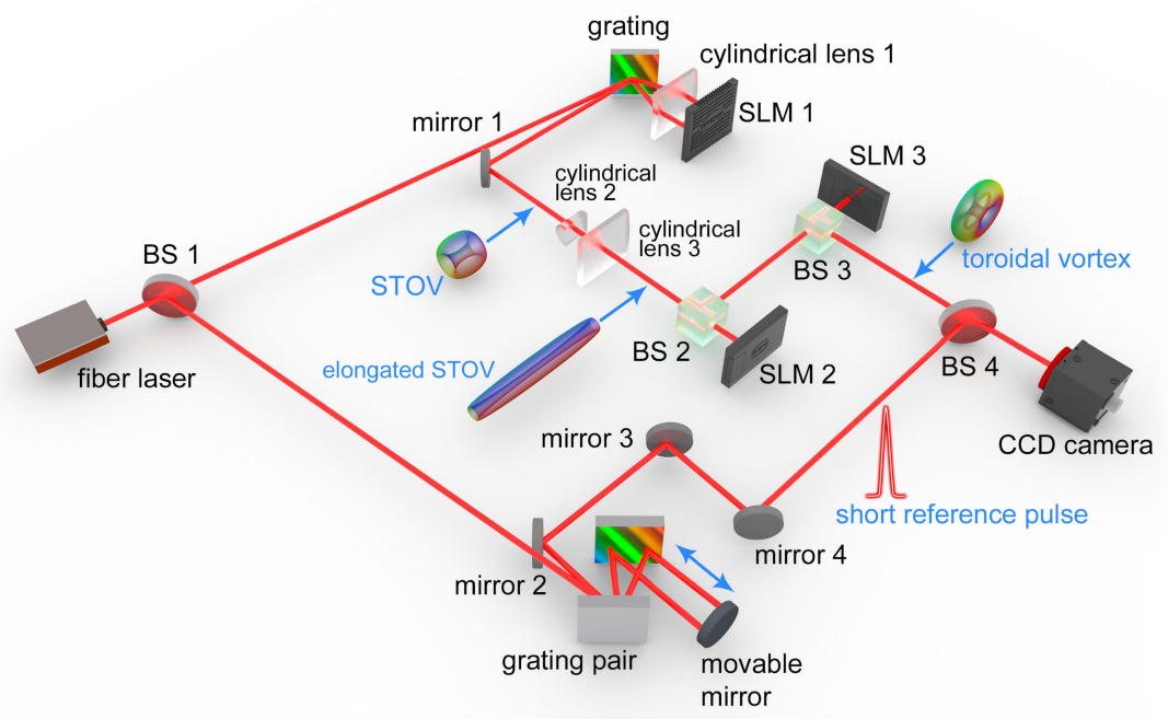 金沙2004路线js5团队在该团队2020年发表于《自然·光子学》(Nature Photonics)“携带横向轨道角动量的时空涡旋光的可控生成”(Generation of spatiotemporal optical vortices with controllable transverse orbital angular momentum)工作的基础上开展了实验验证。图2所示为实验装置图。光源是一个发出皮秒啁啾脉冲的光纤锁模激光器。激光器发出的光脉冲经过由衍射光栅、柱透镜和液晶光调制器组成的二维脉冲整形器。通过液晶光调制器对入射光场施加一个可控的涡旋相位,可以将入射光转化为时空涡旋波包(STOV)。时空涡旋波包经过两个柱透镜组成的光学扩束系统,沿涡线方向拉伸成时空涡管。随后,由第二个和第三个液晶光调制器进行光学保角变换,分别施加变换相位和校正相位,将时空涡管映射成光学涡环。