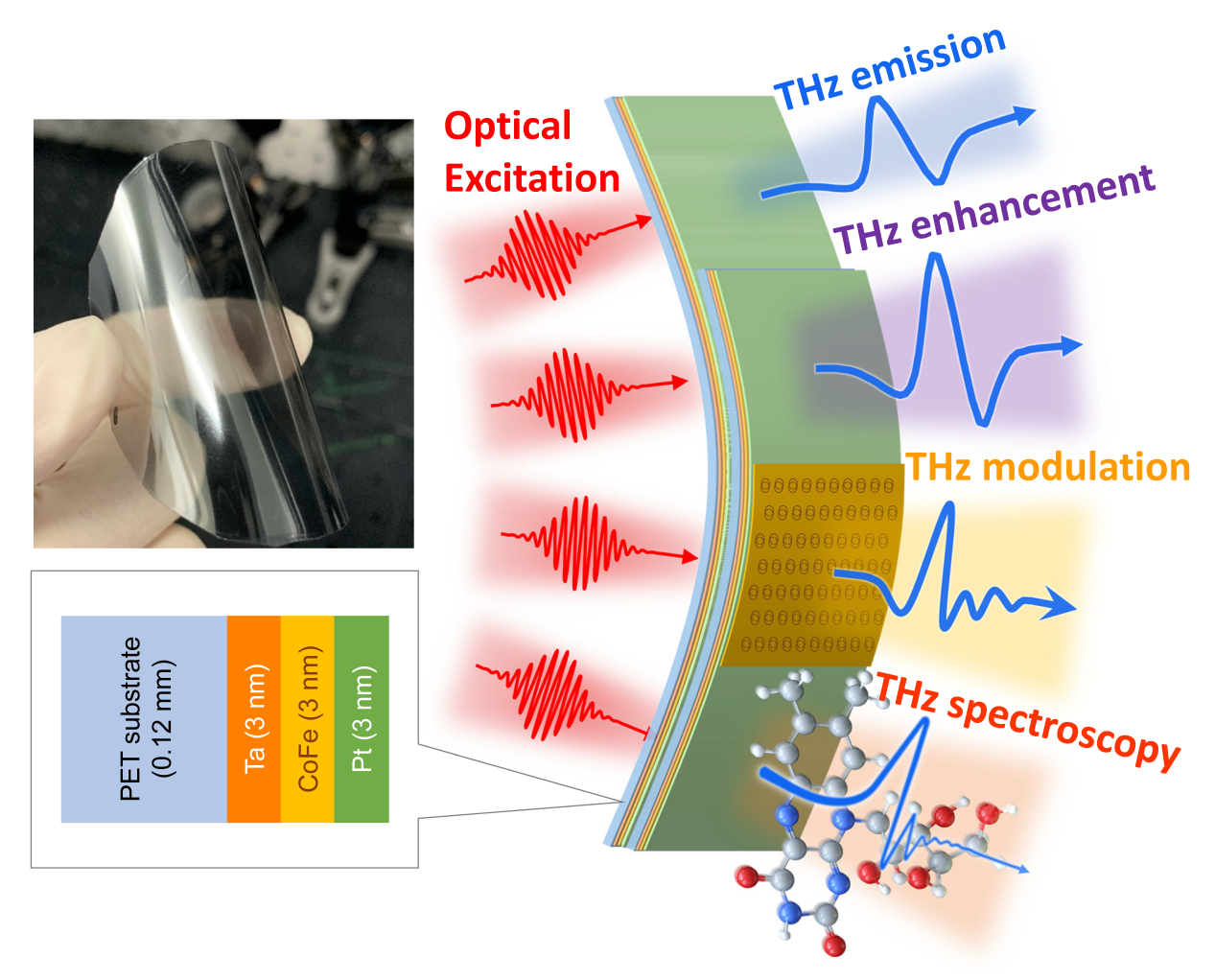 近日,金沙2004路线js5光电学院庄松林院士领导的太赫兹技术创新研究院与复旦大学、上海大学、伍伦贡大学、莫斯科大学的科学家合作,研究了聚乙烯对苯二甲酸酯(PET)柔性衬底上制备的Pt/CoFe/Ta铁磁/非磁异质结构自旋光电子学太赫兹辐射源。研究发现,该柔性太赫兹辐射源具有发射效率高、稳定性好、成本低、偏振可调以及弯曲灵活等优点。重要的是,研究人员创新地提出基于该柔性PET/Pt/CoFe/Ta铁磁/非磁异质结构实现了级联太赫兹辐射源,不仅有效提高了太赫兹脉冲辐射的场强,而且可以通过与超构表面组合,有效地调控太赫兹脉冲辐射的时域波形。研究结果进一步表明,级联的自旋光电子学太赫兹辐射源完全适用于太赫兹时域光谱分析。研究人员认为,级联的柔性PET/STE可以作为基础模块,在太赫兹辐射的产生和调控方面展现较强的研究和应用价值,有望集成到未来的芯片级、紧凑型太赫兹器件和光谱系统中。