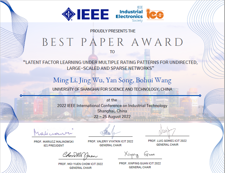 近日,光电学院控制科学与工程专业2019级李明博士在光电学院宋燕教授指导下的最新研究论文《多级评分模式下无向大规模稀疏网络的潜在因子学习》(Latent factor learning under multiple rating patterns for undirected large-scaled and sparse networks )在第23届工业技术国际会议 (The 23rd IEEE International Conference on Industrial Technology , IEEE IES ICIT 2022)上荣获最佳论文奖。该论文第一作者为博士生李明,金沙2004路线js5为第一单位,宋燕教授为唯一通讯作者。