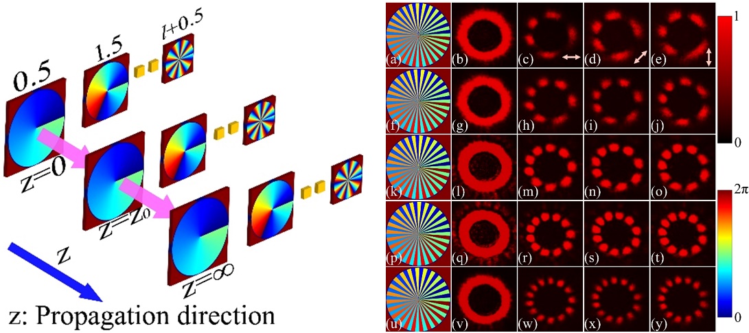 围绕是否存在分数拓扑荷旋涡光场稳定态这一基础性科学问题,庄松林院士团队高秀敏教授及其合作者突破现有偏振奇点和相位奇点相互独立的传统观念,开创性引入偏振维度,研究偏振奇点和相位奇点之间的相互作用,进一步地,提出偏振载体概念,打破现有关于分数拓扑荷及分数阶矢量旋涡光束不可传播的科学共识,证明了l+0.5拓扑荷光学旋涡与整数拓扑荷光学旋涡一样均为光学领域的稳定态,为波动方程的解。进一步地,采用本团队联合研发的偏振型空间光调制器,在实验上不仅实现了可传播分数拓扑荷旋涡光束的产生,而且结合光波模式提取原理,解决了任意光学旋涡并行产生的科学问题[Opt. Lett. 47,3319-3322(2022)]。值得强调的是,此项工作仅仅证明了分数与整数拓扑荷光学旋涡一样,均为物理的稳定态,我们依然无法理解分数拓扑荷光学旋涡稳定态存在的物理本质。为此,研究团队通过构建光学旋涡空间传播物理模型,进一步揭开了分数拓扑荷旋涡光束在自由空间中稳定传播的物理本质,包括:光波衍射极限、光学旋涡的自由空间演变以及相位的时间二元矢量特性[详见arXiv: 2208.01929, v1, submitted: Aug 2022.]。