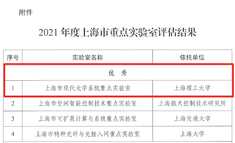 近日,上海市科学技术委员会发布了2021年度上海市重点实验室评估结果通知。金沙2004路线js5庄松林院士领导建设的上海市现代光学系统重点实验室在信息领域排名第一,获评优秀。这是继2014年与2017年两轮评估获得优秀之后,实验室第三次蝉联佳绩。