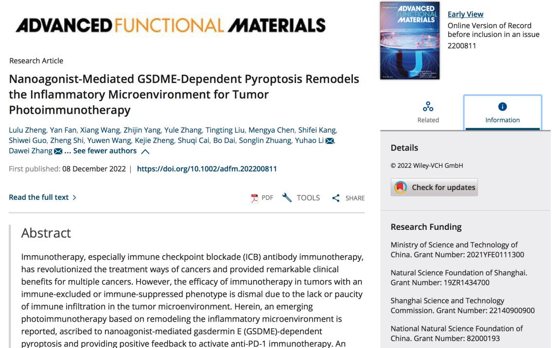 近日,金沙2004路线js5庄松林院士、国家级人才张大伟教授领导的超精密光学制造创新团队在国际高水平期刊《先进功能材料》《Advance Functional Materials》上发表了题为“光免疫介导的GSDME依赖的焦亡重塑肿瘤免疫微环境”(Nanoagonist-mediated GSDME dependent Pyroptosis Remodels the Inflammatory Microenvironment for Tumor Phot-oimmunotherapy)的重要突破成果,该成果和上海交通大学附属新华医院、长海医院合作,研究构建了一种新型的光免疫纳米材料载药体系,通过诱导癌细胞焦亡的方式引起肿瘤部位炎性微环境的改变,增强免疫浸润程度,激活机体免疫应答能力,并且解决免疫检查点抑制剂失效的问题,为黑色素瘤的治疗提供了一种新的方法。光电学院郑璐璐副教授,研究生范岩,材化学院研究生王翔为文章的共同第一作者,光电学院张大伟教授与材化学院李钰皓副教授为文章的通讯作者。该期刊是Wiley出版社旗下的国际材料科学领域最高层次综合性期刊之一,为Nature Index收录期刊,中科院JCR分区为一区,影响因子为19.924。期刊致力于报道材料科学取得的突破性进展,以其高质量的内容和高影响力而闻名,涉及领域包括纳米技术、化学、物理学和生物学。