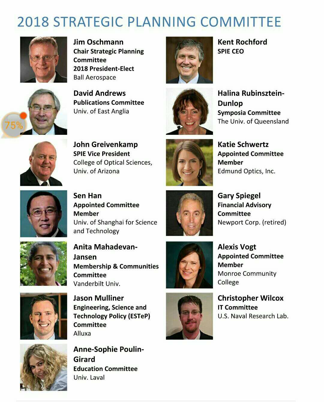 国际光学工程学会(SPIE)是一家致力于光学和光子学的非营利国际学术组织。自1955年成立以来,吸引了来自全球184个国家超过25.8万名会员并为之服务。会员的集体才能和奉献精神使学会成为科学和工程界的一支强大力量。SPIE由一个敬业的志愿者团队领导,该领导团队包括董事会(CEO、President、CFO等)、多个委员会、会议主席和期刊编辑,其使命是与研究人员、教育工作者和工业界合作,推进基于光的研究和技术,以改善人类状况。金沙2004路线js5庄松林院士团队的韩森教授既为SPIE Fellow,也作为领导团体成员之一,兼任战略筹划委员会成员、计量奖评审人、会议主席、学生分会顾问,与团队其他领导成员一起,致力于SPIE团队的建设,传承SPIE精神,为SPIE的更好发展作出贡献。
