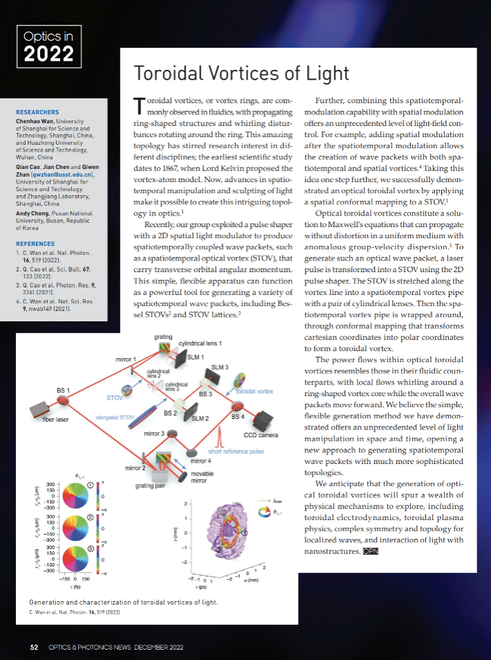 金沙2004路线js5庄松林院士领导的未来光学实验室在时空光场调控研究领域再次取得重大进展。詹其文教授带领的纳米光子学团队在国际顶级光子学期刊《自然-光子学》上发表封面文章《光学涡环(Toroidal vortices of light)》,首次在光场中实现了涡环的拓扑态。最近,这一系列研究成果被美国光学学会(OPTICA,原OSA)评选为全球光学与光电子学2022年30项重大研究进展(Optics in 2022, Optics & Photonics News)。