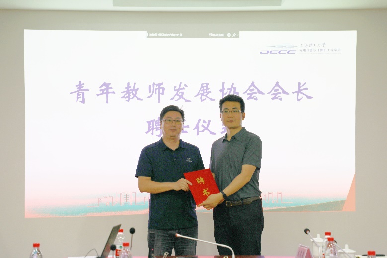 刘鹏介绍了学院青年教师发展协会的成立背景,郑静和袁媛共同为协会成立揭牌,何可为教师代表禹德朝颁发协会会长聘书。禹德朝代表青年教师感谢学院和学校的大力支持,他分享了获聘感言,协会由学院老师们呼吁和建议而来,由萌芽、思辨到变成现实,恰逢其时、任重道远。这个在学校教师工作部与工会指导、学院党委领导下的教师自治组织,需要青年教师们一起努力打造成大家的成长平台,共建成大家的教师之家。