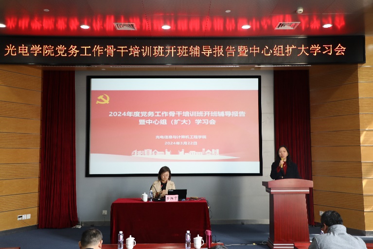 3月22日上午,光电学院党务工作骨干培训班开班辅导报告暨中心组扩大学习会在光电楼一楼报告厅举行。学院邀请了马克思主义学院副教授牛翔宇老师围绕习近平文化思想作专题辅导报告,激励师生进一步统一思想,守牢底线,弘扬社会主义主旋律,坚持立德树人,为事业发展提供强有力的思想保证和精神动力。学院党委书记袁媛主持学习会并作开班动员讲话。学院党委班子、支部书记、支委等党务工作骨干,以及学院中心组成员、班主任、新进青年教师、部分师生党员参加了学习会。