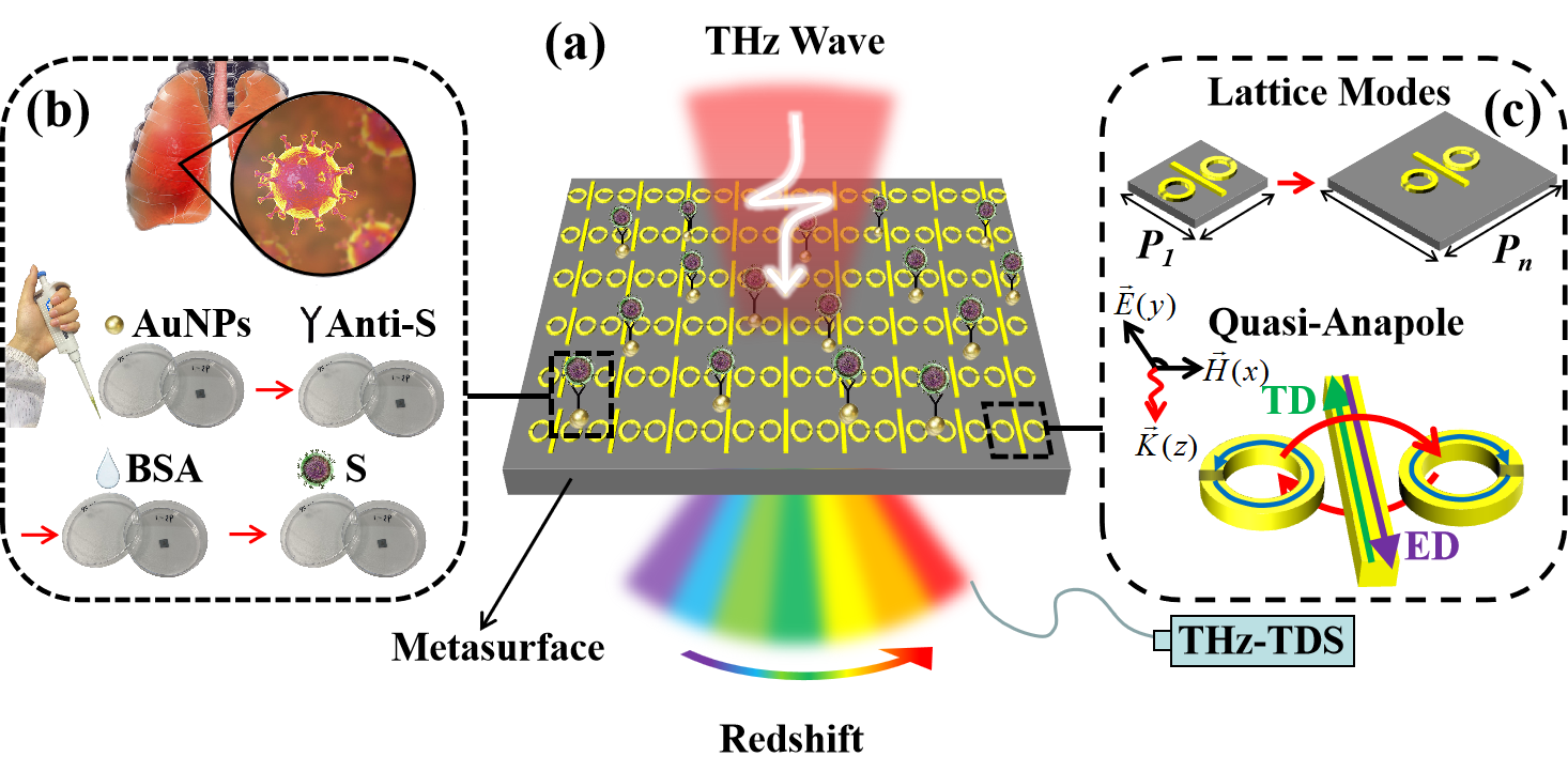 在太赫兹波段,大分子蛋白质等有直接的特征吸收,这是因为分子间化学键,比如范德华键、氢键的振动能级落在太赫兹波段。超表面免疫传感器是生物传感器的一个重要分支,当超表面结构上预先制备特定生物分子抗体时,就形成了一种免疫传感器,其能够高效的吸附相应抗原分子,实现高灵敏度与特异性的太赫兹生物蛋白检测。然而,之前设计的超表面结构存在辐射损耗大,灵敏度低等问题。在物理学中,Anapole模式由于远场观测到的电偶极子和磁偶极子具有等幅反相的特征,对辐射损耗起到了一定的抑制作用。太赫兹技术创新团队联合新加坡南洋理工大学Thomas Tan CaiWei博士和Ranjan Singh教授,提出了一种用于SARS-CoV-2刺突蛋白的特异性检测的高灵敏太赫兹超表面免疫传感器。上海科源电子科技有限公司袁旭军总经理和上海市疾控中心的张曦主任也参与了SARS-CoV-2蛋白的讨论。本工作在设计Anapole模式超表面的基础上,利用Lattice模式对其进行调制,利用超表面周期结构中的非辐射瑞利散射,进一步抑制辐射损耗,将免疫传感器的Q值优化到89FOM达到26.7。研究人员利用金纳米颗粒与SARS-CoV-2蛋白抗体对该超表面进行生物修饰,制备了一种具有特异性的SARS-CoV-2免疫传感器,当抗体浓度为50 pg/mL时,检测极限达到3 pg/mL39 fmol)。实验结果还表明,免疫传感器的检测下限与表面修饰的抗体浓度密切相关。该项工作为高灵敏度和特异性生物分子免疫传感器的设计提供了新的解决方案,在太赫兹生物医学领域有潜在的应用价值。