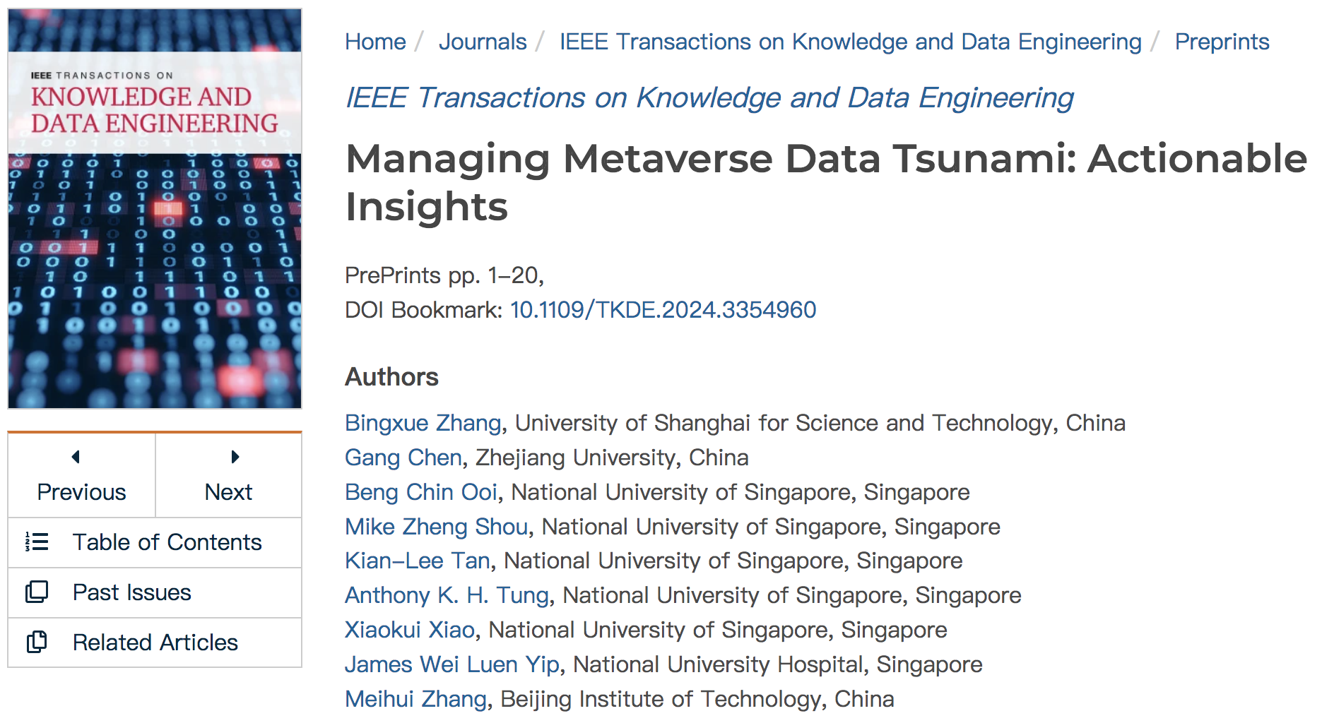 近期,金沙2004路线js5张冰雪副教授以第一作者的身份,联合中国科学院外籍院士、新加坡国立大学Beng Chin Ooi教授、新加坡国立大学计算机学院院长Kian-Lee Tan教授、浙江大学副校长陈刚教授等,在计算机领域国际顶级期刊《知识与数据工程》(IEEE Transactions on Knowledge and Data Engineering)上发表题为“管理元宇宙数据海啸:可行的见解”(Managing Metaverse Data Tsunami: Actionable Insights)的论文,金沙2004路线js5为第一单位。