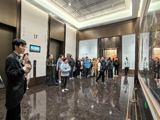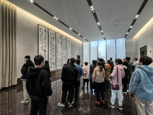 在工作人员的引导下,大家首先参观了星空厅、大会见厅及锦绣厅等多个核心区域。星空厅以其开阔的空间和先进的会议设施,展现了现代城市客厅的便捷与高效;大会见厅则以其独特的墙面设计,让人深刻感受到艺术与建筑的完美融合;而锦绣厅则以其浓厚的中式审美和国宴级的设计标准,让师生们领略到了中国传统文化的博大精深。作为百年建筑,世界会客厅不仅融合了中西方的建筑文化元素,还采用了最先进的科技和环保技术,彰显出独特的海派文化魅力和“海纳百川、追求卓越、开明睿智、大气谦和”的城市精神。