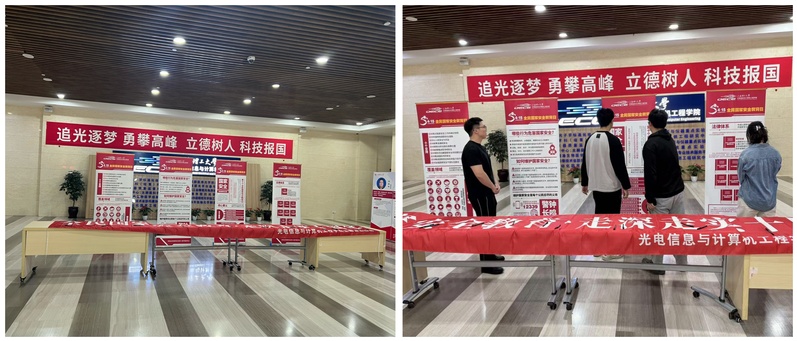 为扩大宣传教育覆盖面,光电学院精心制作主题展板,展板内容紧扣“全民国家安全教育走深走实十周年”主题,结合学院学科特色,重点突出科技安全、科研保密、网络安全等内容,引导师生从日常学习、生活中践行安全责任。