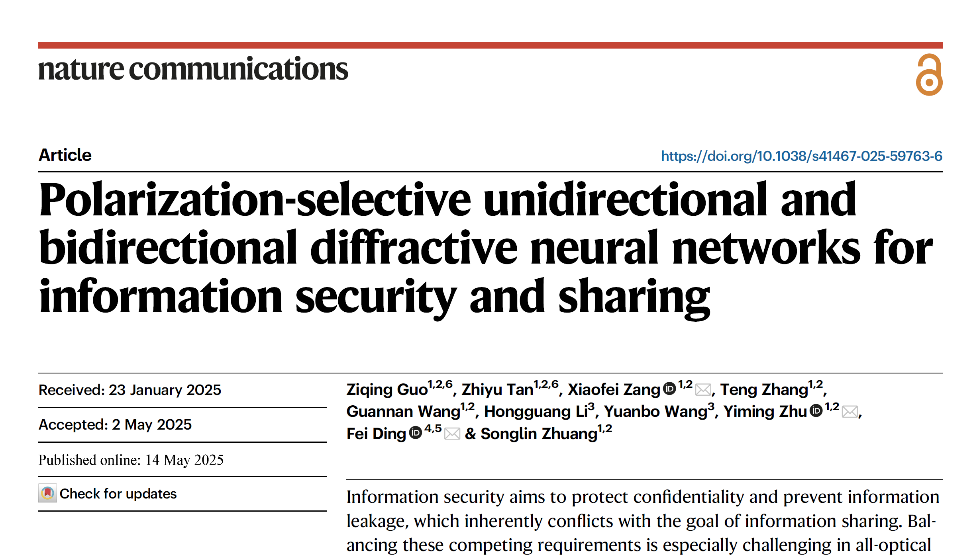 近日,在金沙2004路线js5庄松林院士指导下,太赫兹技术创新团队臧小飞教授、朱亦鸣教授联合东方理工大学丁飞教授课题组,提出了一种实现偏振可选择的衍射神经网络(PS-DNNs)新方法。通过联合相位和偏振多自由度调控,实现了偏振可控的单向与双向网络功能切换,从而同步达成信息加密与共享的目的。研究成果以“超构表面衍射神经网络实现全光信息加密和共享”(“Polarization-selective unidirectional and bidirectional diffractive neural networks for information security and sharing”)为题发表于《自然·通讯》(Nature Communications,IF=14.7,中科院一区)上,博士生郭子晴为第一作者,谭知雨博士为论文的共同一作,臧小飞教授、朱亦鸣教授 、丁飞教授为通讯作者。