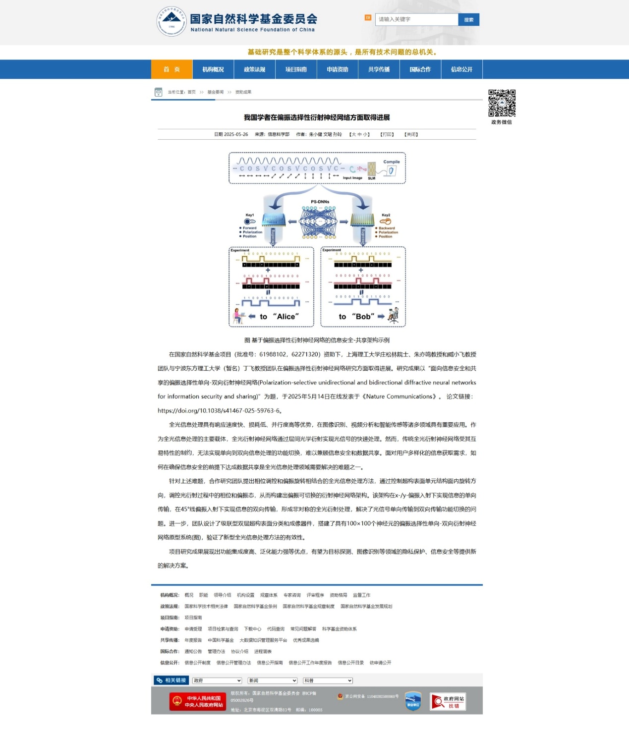 近日,国家自然科学基金委员会在其网站首页“资助成果”栏目,以“我国学者在偏振选择性衍射神经网络方面取得进展”为题,报道了金沙2004路线js5光电学院在偏振选择性衍射神经网络研究方面取得进展,报道如下:
