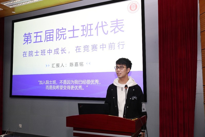 来自往届的优秀学生代表分享了自己在院士创新班的学习经历、科研收获与感悟。第四届学生代表黄昭凤向分享了从“主动联系教授加入课题组”到“从1到2实现创新突破”的成长路径;第五届学生代表陈嘉铭以“从渴望优秀走向实现优秀”为主题,讲述了参与多项竞赛的心路历程,强调了充分准备和沉着应战的重要性;新生代表郭旸表达了对院士创新班的向往与期待,并代表全体新生承诺将潜心学问、携手共进、志存高远。