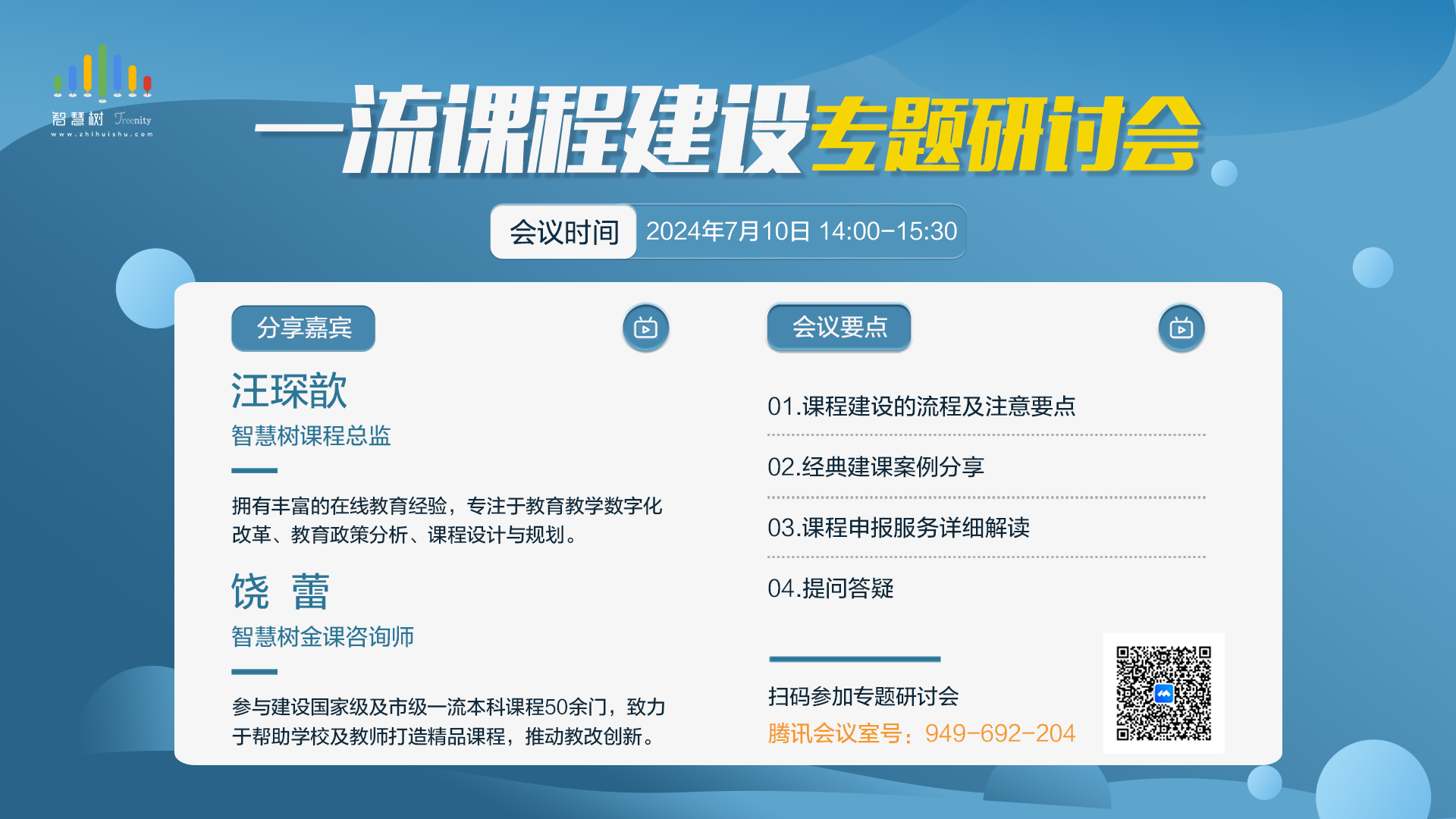 一流课程建设专题研讨会 | 智慧树 | 949-692-204 | 7月10日 14:00-15:30 |