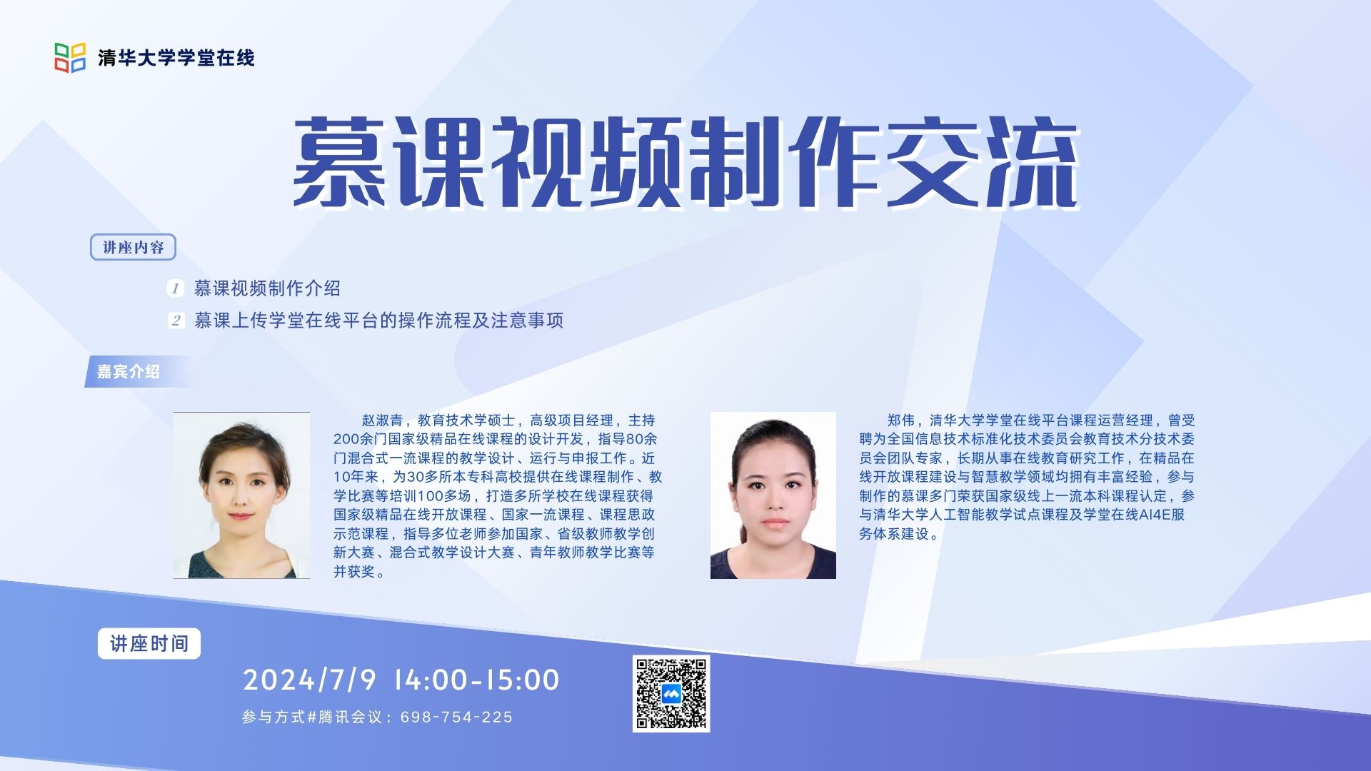 慕课视频制作交流 | 清华大学学堂在线 | 698-754-225 | 7月9日 14:00-15:00 |